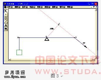 由于学生认知水平、思维水平有限再加上物理概念的抽象和过程的复杂性,造成学生的认知困难,形成教学难点。信息技术在突破难点方面有着重要作用。信息技术具有的直观、形象的特点,可以化抽象为具体,丰富学生的感知突破难点。信息技术具有的动态性,可以直观动态地展示复杂过程的变化,帮助学生把握物理过程的变化特点和实现意义建构,从而有效地突破教学难点。例如,在《探究杠杆的平衡条件》一节中,关于力臂概念,很多学生尽管能正确说出定义而遇到实际问题时仍把支点到动力或阻力作用点的距离作为力臂。针对这一教学难点,利用几何画板软件制作“力臂课件”(如图3)动态演示:力的方向改变时,力臂的大小在变,但是力臂和力的作用线相互垂直的几何关系没有变,同时可以看出力臂应是支点O点到垂足C点的距离,而不是支点O点到作用点A点的距离。通过课件的动态演示可以帮助学生促进对力臂概念的意义建构,在头脑中形成正确的认知结构,进而促进学生对杠杆平衡条件的实验探究以及对杠杆平衡条件规律的正确理解。