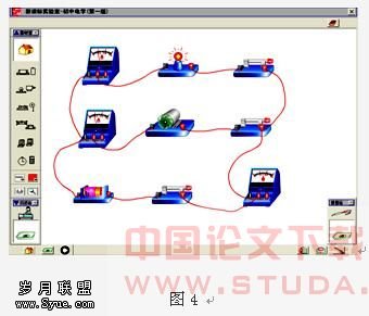 仿真在物理教学过程中,是通过模拟手段,特别是信息技术手段,再现真实世界的某些方面,让学生在这样的背景中通过实际操作而学习的方式。在进行实验探究之前,学生借助几何画板或仿真物理实验室等仿真模拟平台,在微机上模拟各种实验情形,对物理现象或过程的形成初步的认识,这就减少了实际实验探究的盲目性增加了探究的针对性。利用信息技术的仿真模拟功能,对实验探究可以起到导向辅助作用,提高学生的实验探究能力。例如,在《探究电路中的电流》一节中,让学生利用“新课标实验室-初中电学”(坤为地软件园陈邦明开发)仿真模拟软件,从器材室里自选器材模拟连接电路,探究串并联电路的电流规律(如图4)。在本节中通过仿真模拟可以培养学生的电路设计能力及连接电路的实验技能。本软件还有这一特点:退出系统前必须归还所有器材,否则系统拒绝退出。这样还可以有意识地去培养学生完成实验后整理器材的良好习惯。