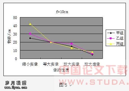 对实验数据进行地处理和分析是一种重要的科学探究能力。表格和图像是处理、分析数据的常用方法,但图像比起表格要更直观形象。在初中物理探究教学中,教材和教师一般要求学生用表格记录和处理数据,用图像处理数据对于初中生来说难度较大。教学中可以充分发挥信息技术在绘制图像处理数据方面的优势。例如,在《探究凸透镜成像规律》分析与论证环节,学生在教师引导下对实验记录表格中数据进行分析,寻求凸透镜成像的规律。大部分学生通过交流讨论可以发现“凸透镜成不同的像时,物距与像距所满足的关系”,但是学生很难发现“凸透镜成不同的像时,物距与焦距的关系”。这一规律是凸透镜成像的基本规律,怎样引导学生发现呢?笔者利用信息技术对数据处理进行了有益的尝试。图5是利用Microsoft Office Excel数据处理软件得到的凸透镜成像数据处理图表。学生根据这个直观的图表,比较容易得出凸透镜成像的基本规律。