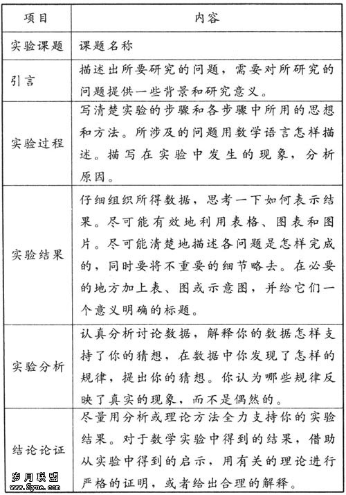 跟一般实验一样,学生数学实验也应有实验报告撰写环节。实验报告是实验进程中的最后一步,是实验成果的书面和反思。通过撰写实验报告,可以培养学生对现象的分析能力和实验数据的处理能力。因此,学生实验一般都应写实验报告。报告中书写的句子和段落应完整,力求行文既清楚又具可读性。报告可采用如下形式: