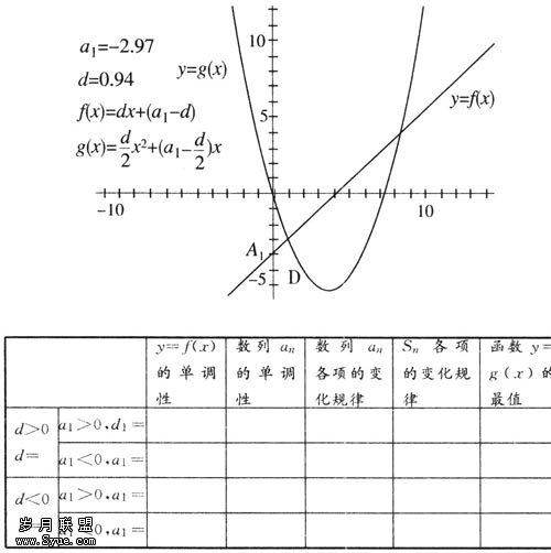 是二次函数,其图象是抛物线。在同一坐标系中做出两函数f(x),g(x)的图象,从图象上探求所讨论的问题。教师可以让学生自由探索,也可在课前用“几何画板”设计好教学课件(如图样式)。如果是后者,实验中只需让学生拖动点A1和D到不同的位置而改变数列的首项和公差,记录a1和d的值,观察图像的变化,将观察结果填入下表,从中发现数列an的各项和Sn各项的变化规律?