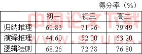 仅以归纳推理法、演绎推理法和逻辑法则的学生认知状况为例,对以下几个年级(年龄段)的调查取样比较,我们便能发现在不同时期青少年的差异,[1]见下页表。