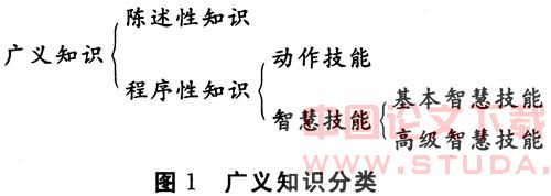 早在十年前,本文作者之一皮连生就提出,至20世纪末,还没有一家理论能全面解释学生的各种学习过程和有效学习的条件,学习理论需要“多样综合”,也就是有选择地分别采用不同的学习理论解释不同的学习过程和条件。在人的能力学习领域,由于认知心理学的研究,已具备条件提出一个综合性的能力学习理论。该理论首先假定:习得的能力是由广义知识构成。广义知识包括狭义知识和广义技能。广义技能可分为动作技能、智慧技能和认知策略(含元认知技能)(见图1)。