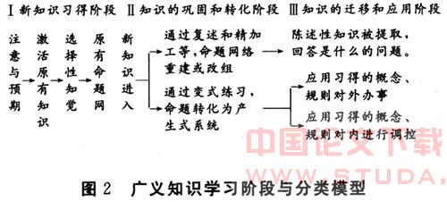 广义知识可分为陈述性知识和程序性知识,但程序性知识的前身是以命题表征的陈述性知识。因此广义知识学习的第一阶段都是陈述性的。陈述性知识习得的心理过程是新知识被原有相关知识同化,形成新的结构的过程。根据信息加工心理学,新知识习得需要经历注意、激活原有相关知识、选择性地知觉新信息、新信息与原有相关知识相互作用四个信息加工步骤,其结果是新的信息的心理意义被习得。广义知识学习的第一阶段需要采用信息加工心理学的信息加工阶段论和奥苏伯尔的同化论来解释。由于第一阶段学习的重点是解决新知识的理解问题,所以奥苏伯尔的同化论是解释意义习得阶段最重要的理论。奥苏伯尔同化论也就是当前流行的建构主义学习理论的具体陈述。学习的第二阶段,部分陈述性知识如符号、事实(非概括性命题知识)、部分概念、原理仍然以命题形式表征,通过复习或重新组织而得到巩固;另一部分陈述性知识主要是新习得的概念和原理经过变式练习,其心理表征形式由命题转化为以“如果/那么”形式表征的产生式规则,陈述性知识便转化为办事的规则,实现了知识向技能的转化。传统学习理论在论及学习的第二阶段时主要关心知识的保持,防止遗忘。这种理论来自机械言语材料的记忆研究,只适用于解释机械学习的巩固,不适用于有意义的知识学习。为了解释广义知识学习的第二阶段的巩固与转化,我们需要运用信息加工心理学的陈述性知识与程序性知识划分的理论以及陈述性知识向程序性知识转化的理论。由于加涅所区分的智慧技能和认知策略都可以纳入程序性知识范畴,所以还必须根据实际需要,兼用加涅的智慧技能和认知策略的理论以及信息加工心理学的产生式理论来解释知识向技能转化的过程和条件。广义知识学习的第三阶段指习得的知识的运用。从图1可见,三类知识的运用是不同的,陈述性知识的运用是习得的知识被有意识地提取出来。其输入与输出是相同的。如通过学习知道“北京是的首都和、文化中心”(输入)。当回答“中国的首都和政治、文化中心在哪里?”这个问题时,答案只能是“北京”(输出)。而不能回答是“上海”。智慧技能在运用时其输出不同于输入,如给予“1/3+1/4=?”(输入),学生经过一系列运算,给出的结果是7/12(输出)。认知策略不能独立学习和运用,总是伴随于知识和智慧技能学习与运用。其运用表现在提高了学习效果或解决了缺乏认知策略的应用便无法解决或难以解决的问题。