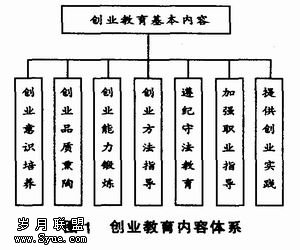 1.创业意识培养。引导高职学生增强创新意识和创业精神,教育学生全面理解创业的深刻含义,使高职学生认识到创业人才的培养在我国当前就业形式下的重要意义。通过意识的教育,使学生转变就业观念,认识到自主创业是社会进步的需要,是自身生存的需要,也是实现自我价值的需要,是更高层面上的就业。 2.创业品质熏陶。主要培养学生爱岗敬业、勇于创新、不怕挫折、敢冒风险的精神,同时对学生进行自强自立教育,使学生树立坚定的信念,具备锲而不舍的韧劲。在校园内形成创业教育的氛围,让学生时刻感觉到创业的紧迫感,使创业成为学生就业的自觉需要。 3.创业能力锻炼。毕业生不敢尝试创业的一个主要原因是创业资本的缺乏,而创业资本除了必须的启动资金外更重要的是创业者所应具备的综合素质,即创业能力。创业能力的锻炼既要发挥职教优势培养学生的专业技能,又要培养学生适应社会、适应市场、适应竞争的综合素质。 4.创业方法指导。通过创业专题讲座、创业课程讲授、创业方案竞赛等活动,培养学生的创业方法。对学生设计的好的创业方案,老师可进行专业的修改与指导,通过方案的不断完善,使学生掌握创业所需的.一般方法。 5.遵纪守法教育。这仍然是一种素质的培养,自古以来,我国有“无商不奸”的说法,在当前我国市场经济尚未完全成熟的背景下,对学生进行遵纪守法的教育尤其重要。通过各种 活动开展诚信教育,让学生了解我国有关法规的内容,懂得一切创业活动必须在法律允许的范围内进行。 6.加强职业指导。职业选择是创业的基础,正确的个人定位会给创业一个良好的开端。将学校的职业指导工作与创业结合起来,在职业指导过程中渗透创业教育。 7.提供创业实践。利用学校已有资源给学生提供创业实践的机会,如小策划、到私营企业参观,甚至在校园内设置创业园区,给学生提供创业实践的舞台。 三、高职创业教育课程结构体系 实现创业教育必须深化课程体系改革.摈弃陈旧的教材和教学方式,加大实验、实习和社会实践等教学环节在整个课程体系中的比重。在高职创业教育体系中,课程结构体系是核心。一般来说,创业者的知识结构分为三种类型:专业技术知识、经营管理知识、综合性知识。为此,创业教育课程应该在传统职业教育课程基础上突出创业,把“创业社会常识”、“创业指导”等与创业密切相关的课程增加进去.形成学科课程、活动课程、隐性课程相结合,必修课、选修课相统一的创业课程结构体系,如图2所示。