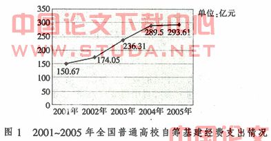 强调经常性成本,忽略建设性成本高校的成本包括经常性成本和建设性成本两部分。经常性成本(又称可变成本)包括人员费用和公用费用两项;建设性成本(又称固定成本)包括基本建设经费(如教学楼、教学设施、图书馆、实验室、场等的建筑费和大型仪器设备购置费)以及购买或租赁耐用资产的支出、利息等。那些认为高校扩大规模可以降低办学成本的学者的依据是,在高校的经常性成本中人员性经费占有很大的比例,因此,高校人力资源的使用效率将是决定经常性成本的最重要因素之一。而要提高人力资源使用效率,在不减少现有教师数量的基础上就要扩大在校生规模。在研究规模效益时,学者们通常假定建设性成本不变(或变化较小),以生均经常性成本的变化为依据来研究学校的适度规模。可见,在研究规模效益时学者们假定建设性成本投入不变或变化不大(或因为难以评估、折算而忽略这一因素),也就是说,只有在不新建教学楼、图书馆、实验室、体育场以及不新添教学设施、大型仪器的前提下,才能在学生数量的不断增加而致生均经常性成本减少时,实现规模效益。但实际的情况却是,高职院校往往不顾自身条件盲目扩招,造成资源的紧缺,进而又被迫购买土地、兴建校舍、购买试验设备等等,大大增加了建设性成本的投入。而建设性成本增加了,高校规模效益的前提条件也就发生了变化,必然会带来规模的不经济。当学校处于快速时期时,建设性成本往往占有很大的比重。如图1所示,2001~2005年,全国普通高校自筹基建经费支出呈大幅度上涨,2005年的自筹基建经费已接近2001年的2倍。而同年全国高职高专的基建支出已经占据了经费总支出的17.21%,这必然会给高职院校带来沉重的财务压力。