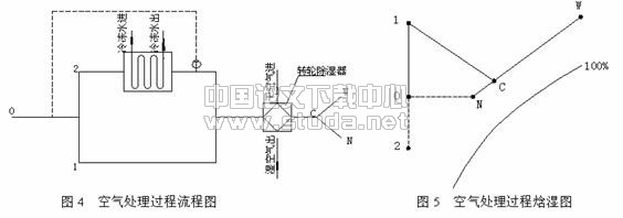 空气的除湿过程有两种方式,一是采用传统的空调方式,即送风由冷水盘管或制冷剂直接蒸发进行冷却除湿,盘管表面温度必须低于送风露点温度以进行除湿处理,空气经过此处理过程后会过冷,因此在送入室内之前往往需要进行再热处理;另一种方法是采用转轮硅胶除湿器进行除湿处理,因而比较适用于送风温度相对而言比较高时需要去湿的场合。单独采用第一种方式,由于空气处理后过冷,还需要进行热处理,显然不是节能之举。对于第二种方式,由于除湿时潜热转换为显热,送风温度过高,也不适用于一般空调系统。因此,可以采用两种方式的综合,其空气处理过程及焓湿图如图4、图5所示。