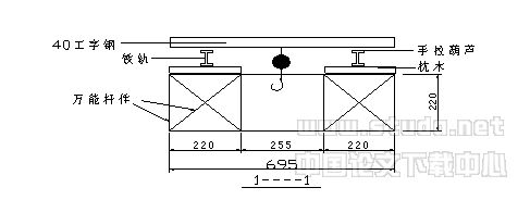 导梁架由万能杆件直接在事先预制规划好的桥梁上进行拼装,(一端架在左边墩上)经,导梁架总长32.0m,高2.2m,中间宽为2.55m长运输道,满足力学及施工要求。导梁架顶部间距80cm铺枕木,枕木上铺双铁轨道,在铁轨上放置天车,天车利用轨道可前后移动。两导梁架上的天车之间用I40工字钢连接,工字钢上安装葫芦,作为起吊动力工具(详见附图)。