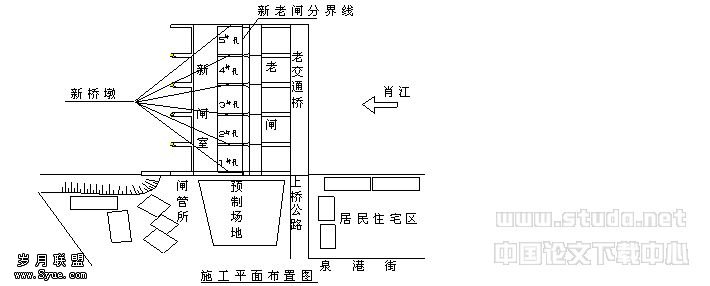 本工程工期紧,吊装安排在汛期,闸室已过水,临近的老闸未拆除,对吊装带来诸多不利因素。(平面布置图见附图)全桥总长71m,宽8.76m。桥的边梁和内梁各10根,总长13m,高为1.10m,边梁面宽为1.89m,重16.85T,内梁面宽为1.60m,重16.43T。均在两端及中间设置隔板,隔板两侧及顶上分别预埋14㎜厚钢板,梁两端底部预埋(与底面在同一平面)25×20×14(㎜)钢板,桥面预埋(高出桥面15㎝)Φ28圆钢吊环。
