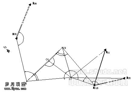 因施工现场地形等诸多不利因素影响,点位布置受限,而且与原有东北水利水电勘测设计研究院布设的二等网点通视条件差,通过对二等控制网点可利用性的评估及经过网型优化,最终确定以附和导线网的形式布设厂房施工控制网。利用M05、M09、M15、M11作为起算点, C87、C8、C9、C4及M15布成网型,同时观测M11~C7、M08~C7及M15~M08三条加强边,方向、距离和天顶距的观测数为41个,最大边长为1400m,最小边长87m,平均边长为281.7 m。按四等三角测量的精度要求实施。采用经过检定的拓扑康GTS710全站仪(仪器标称精度为测角精度1.0″,测距精度2+2ppm)进行测角测边。