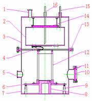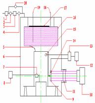 低温真空光学实验装置系统示意图如图1所示,1-机械泵 2-预阀 3-分子泵 4 -高阀 5 -铜带 6 -低温真空腔 7 -直线电机 8 -电源 9 -被测量光学系统 10- ZYGO干涉仪 11 -光学窗口 12- 监控机 13 -温控电路 14- 铂电阻 15- 电热器 16- 液氮箱 17 -活性炭 18- 氮气19 液氮 20 低阀。低温真空腔体是实验系统的核心部分,其示意图见如图2,1—抽气管 2-液氮桶 3-上腔体 4-铜带 5-引线出口 6-支撑平台7-下腔体 8-电机支撑9-梯形支撑10-光学窗口 11-O形圈 12-动镜支撑框架 13-O形圈 14-活性炭 15-出气管16-进液管。腔体总高461mm,外壳直径284mm。内有圆柱形液氮容器,可以储存液体约4升。其中的光学元件支撑框架是专门为动镜设计的,其高度177mm。整个腔体可以测试直径小于250mm,高度小于200mm的各类反射镜和光学元件。