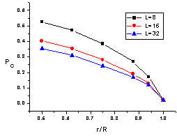 为了制冷机设计的优化,计算比较了不同尺寸结构管路的传输几率,下面图3是对不同长度L(mm)、不同内外径比值(r/R)环路的传输几率比较(外径设为16mm,改变内径以改变内外径的比值)。由图5可知,长度越长,间隙越小,传输几率越小,而且间隙变化对传输几率的影响比长度的影响要大一些。根据此规律可以在设计的时候对制冷机尺寸进行优化。