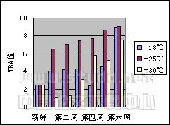 (1)在前五周,3个温度下金枪鱼的TVB-N的变化都不明显,到了第六周时,在-18℃的值最高,而-25℃、-30℃变化不明显。