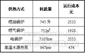 高温水源热泵除具有环保的特点外,更具有明显的经济节能优势,下面将采用高温水源热泵回收利用冷凝热制备生活热水同现行的各种方式(燃油锅炉、燃气锅炉、电锅炉),就运行成本依据基础数据作分析比较如下表(表中均以每小时制备100t生活热水为比较单位)