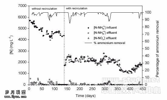 在第一次运行所取得的结果证实进水氨氮浓度5000mgN-NH4+L-1处理困难,由于小的去除百分比下降导致硝化反应器500 mgN-NH4+L-1积累。去除百分比下降的原因是NLR的增加超过了系统反硝化速率的直接结果。在500mgN-NH4+L-1,20℃和pH=7.5时,自由氨浓度大约7.7 mgN-NH4+L-1。自由氨引起氨氮氧化和亚硝酸氧化菌的抑制。抑制也导致1500N-NO2-L-1的积累和硝化速率从0.15下降到0.10 mgN-NH4+VSS-1d-1。为了减轻这个抑制,当硝化反应器中氨氮浓度接近300mg N-NH4+L-1数值时,NLR开始下降了。