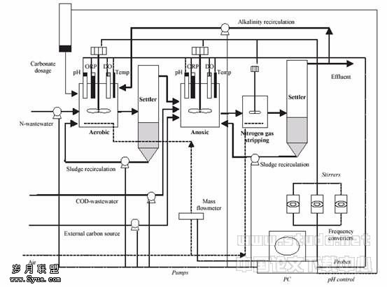 含氮废水含有碱度比硝化根据化学计量所需碱度药少。为了解决这个问题,一套自动控制法通过增加固体碳酸钠控制硝化反应池的pH。这个控制供应了必要的碱度,因此pH条件有利于反应。硝化反应最佳pH值范围为7.5-8.5。本实验选择7.5值,由于高的pH氨氮物会转化为氨,而氨会抑制反应。添加碳酸钠提供了硝化细菌适宜的条件,避免了使用它们培养基之一的物质无机碳,该物质会产生潜在抑制。