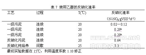 活性污泥反硝化系统处理硝化系统出水,在不同阶段使用两种不同外加碳源。第一种碳源主要是乙醇,第二种碳源是甲醇(60%)、丙酮(10%)和异丙基乙醇(10%)的混合物。为了研究两种外加碳源对反硝化速率的影响,MDR在稳定状态估算的。第一种碳源在20℃取得的MDR大约为0.64 gN-NOx-gVSS-1d-1,然而第二种碳源在25℃是0.17 gN-NOx-gVSS-1d-1。如果温度系数考虑的话,使用乙醇的反硝化速率大约高于使用甲醇的反硝化速率6倍。