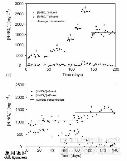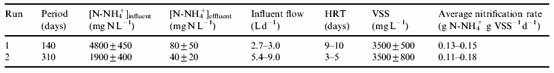 和那些工业规模处理厂相似的条件下进行实验确定MNR,连续等等。在进行那些实验遇到的问题是含氮废水中高浓度,因为如果NLR比MNR大,大量氨氮积累将会发生。积累抑制了反应,所观察到的硝化速率不是最大值。因此,实验逐渐地、控制 NLR增长的进行。紧紧当NLR稍微超过MNR时,法才有一些氨氮积累;但是,观察到硝化率依然时最大值。