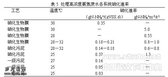 图5将本实验25℃时MNR值与不同处理高浓度、氨氮废水法已出版的数据相比较。由于大多数早期数据在25℃取得的,因此MNR也选择该温度。本实验MNR明显高于BNR一级污泥法MNR见表。这是合乎逻辑的结果,由于在一级污泥法进水/N比率对可完成的MNR的不良影响。