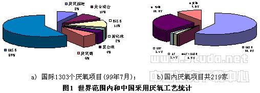 对各种工艺的应用进行统计,在世界范围(不包括)内到99年共统计了1303个采用了不同类型的反应器(见图1a)。其中有近800座采用UASB反应器,占全部项目的59%。UASB反应器最大的优点是结构简单便于放大、运行管理简单。EGSB目前虽然仅占工艺应用总数的11%左右,但是考虑到其是近年来刚刚开发的工艺,其占据市场的速度非常快,在新建处理装置中占有很大的比例。而在我国采用各种处理技术据不完全统计,到99年共有219个项目采用不同类型的反应器(见图1b)。其中采用UASB反应器的有120座以上,占全部项目的58%,基本与国外应用情况相类似。