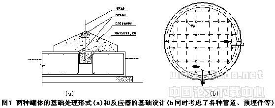 应用上述两项技术由于罐体所用材料较少,在基础承载力中几乎可以不考虑罐体自重对基础的承压要求。在基础底板浇筑时,按所要制作的罐件直径在底板表面留一条宽150mm,深100mm的预留槽,槽内按直径均匀放置一定数量的预埋件,反应器制作完成后,放入预留槽内,用螺栓将罐体和预埋件固定,然后用膨胀混凝土和沥青等材料来密封,最后覆细石混凝土保护层(见图7a)。罐体的设计是设备化的一部分工作,可对不同高度和直径的反应器的结构进行系列设计。这样整个反应器的设计仅仅是基础的结构设计,这在结构设计中比较简单。图7b是基础图设计之一,这样整个反应器池体和基础的设计就形成了系列化。