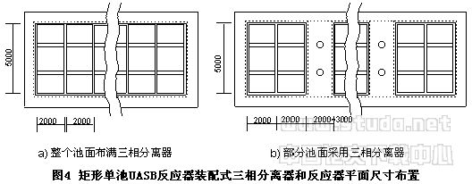 混凝土结构的UASB反应器是最为常见的结构和材料型式,但是采用标准化和系列化的设计必须考虑结构的通用性和简单性,在此基础上形成的系列化才推广的价值。池体的标准化主要是根据三相分离器的尺寸进行布置的,笔者采用的三相分离器的平面尺寸是2×5m。根据这一形式布置池体有以下几种方式(图4)。图4中(a)为整个池表面均采用三相分离器的形式,而图4b是池顶的一部分采用池体本身结构构成气室。这样可以节省一部分三相分离器的投资。标准化可以分为单池单个分离器和两个并列分离器,大型结构可采用双池公用壁的形式。很明显如果需要也可以构成双池每池两组分离器的形式。由于三相分离器的尺寸原因,池子的宽度一般以5m为模数,长度方向以2m为模数。原则上如果采用管道或渠道布水,池子的长度是不受限制。如前所述由于反应器的长宽比的范围涉及到池子的经济性,所以在上述范围内选择要结合池子组数考虑适当的长宽比。