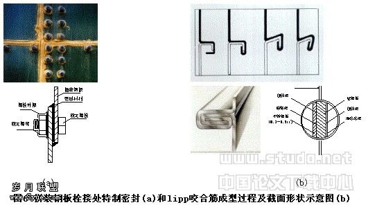 Lipp罐制作时薄钢板通过一台成型机和一台咬合机,在成型机上薄钢板上部被折成h形而下部被折成n形,在咬合机上薄钢板上部与上一层薄钢板的下部被咬合在一起的成型过程和截面形状(如图6b)。废水处理中被处理废水具有腐蚀性(如酸碱废水)的废水,或处理工艺过程中产生腐蚀性(如处理)的情况,采用镀锌板无法像搪瓷钢板一样法满足罐体材料具有耐腐蚀的要求。而全部用不锈钢卷板来制作罐体其制作成本相当高,通过复合机械,将镀锌卷板与0.3mm厚度的不锈钢薄膜复合在一起,其截面形状如图6b所示。