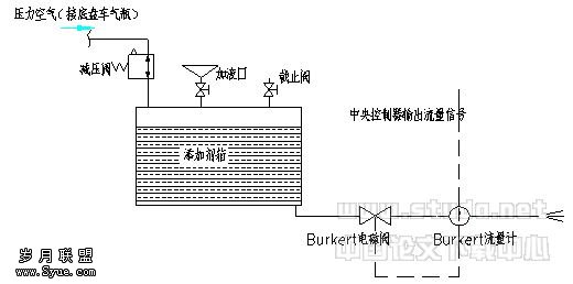 该套系统的工作过程是:添加剂箱箱体为一密封的箱体,给充液的箱体内通入压力空气,压力空气来源于底盘车的空压机气瓶。通过一个减压阀减压,使进入添加剂箱的空气压力稳定。工作时中央控制器给Burkert(宝得)流量计通入一个流量信号,Burkert流量计控制Burkert电磁阀的开度,通过开度的变化来改变输出流量。流量计检测流量与中央控制器的流量信号对比,再次调整电磁阀的开度,使输出流量达到要求的流量。这样Burkert流量计和Burkert电磁阀就构成了一套闭环系统,流量计与电磁阀自成系统,模块性好,中央控制器只需给定需要的流量信号即可。而且底盘车提供的电气接口完全可以满足Burkert流量计和Burkert电磁阀的要求。有关Burkert流量计和Burkert电磁阀的详细情况及使用请查阅Burkert产品。在此不再详述。