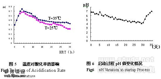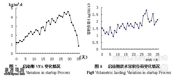 在实验启动阶段,我们采用较低的初始负荷,继而通过逐步增加负荷来完成反应器的启动。在启动后,通过较大有机负荷的进入,使得VFA富集,致使pH值的降低,抑制产甲烷菌的生长,达到二相分相的目的。