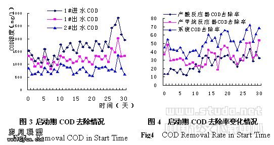 在反应器启动阶段,我们对二相反应器中产酸反应器的进出水和产甲烷反应器的出水的COD、pH和VFA进行了连续监测(频率为每天一次),以观察反应器的启动状况。