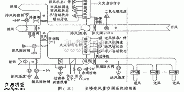 工程简介: 厦门国际会展中心用地面积46.8公顷,一期建筑面积149700平方米;整个会展建筑东西向长285m,南北向长432m。 主楼地下室主要为停车库、设备用房;主楼一层设有五个展厅,每个展厅6561㎡。一、五段展厅净高15m,为双层网架结构;二、四段展厅净高10m,为桁架结构;三段展厅净高.6m,为钢结构。一、二、四、五段展厅设有10m高的门厅;三段设有15m高的门厅。同时,展厅东西两侧一至三层设有小会议室、洽谈室、办公室、信息中心、厨房、餐厅及空调机房和其它设备用房。三段三层以上设轻型展厅、演讲厅、观海大厅、会议室、空调机房等。辅楼主要为酒店及其配套设施。系统简介: 空调系统: 厦门国际会展中心设计总冷负荷29719kW(实际主机配置为27783kW),在地下冷冻机房内设4台双机头离心式冷水机组(单机头制冷量3341kw,可单个机头启动)和一台1055kW螺杆式冷水机组(调节负荷用)。冷媒采用环保型R134a。冷冻机房内设冷媒泄漏报警系统,并设冷媒泄漏排放管。在一段网架上设9组冷却塔,其中8组冷却塔(每组800m3/h)对应8个压缩机头,另一组冷却塔(250m3/h)对应螺杆机组。网架上冷却水管采用不锈钢滚珠支座支承以减少摩擦阻力。冷冻水系统采用一、二次泵系统,一次泵定流量,二次泵变频调速变流量以利用于节能。冷却水系统采用定流量系统。选用闭式膨胀水箱,利用气压罐原理定压、补水,膨胀水箱设于地下室冷冻机房内;各组立管末端均设自动排气阀放气。主楼各部分空调均采用全空气空调系统,按实际情况设有定风量空调系统和变风量空调系统,空调机选用组合式空调器。各层冷冻水回水干管和各空调箱冷冻回水管上均设平衡阀。展厅部分送风口选用送风距离较长的旋流风口;考虑到展厅明装风管的美观及送风压力较大(余压最大达1250Pa)等因素,送风管选用强度较高的螺旋风管;门厅部分由于进深较深,达40m长,且门厅上空无法布置风管,采用圆形喷口、地送风、送风柱、条形散流器、方形散流器相结合的送风形式。其它部分除国际会议厅有部分设旋流风口和圆形喷口外,送风均采用条型散流器。 主楼共设有48个空调系统(均设单独送、回风机)。其中展厅、门厅、演讲厅等大空间采用定风量空调系统;办公室、小会议室、洽谈室等小开间部分采用变风量空调系统,末端采用VAV装置。在设计时,充分考虑火灾补风、排烟尽可能利用空调送、回风系统进行,减少一次投资。 防排烟: 由于展厅和门厅净高高、空间大,超出我国现行的消防规范,按照国外合作方RSG提供的资料、计算机模拟实验结果和消防专家论证会意见: 15m净高展厅、门厅排烟量按1.9次/h换气次数计算; 10m净高展厅、门厅排烟量按3.5次/h换气次数计算; 7.6m净高展厅、门厅排烟量按4.9次/h换气次数计算。 所有火灾补风系统均在新风入口设置管道式烟感。当新风受烟火威胁时,自动关闭补风系统。 节能措施: 1、 公共区域部分采用低温送风,送风温度12℃,减少送风量,降低风机耗能; 2、 冷冻水系统采用大温差(6.7℃~14.4℃),减少冷水量,降低水泵耗能; 3、 末端盘管回水管均设二通阀,根据负荷要求随时调节冷冻水流量,二次泵变频调速变流量,并在一次冷冻水供回水管上设实时流量计,实时监测旁通的冷冻水量,调整压缩机头的开启台数,以达最大的节能效果。 4、 采用VAV系统,设计采用较先进的变静压变温度控制方法,提高节能效果; 5、 充分利用自控手段,全部暖通空调系统纳入BA系统进行能源管理。 下面结合厦门会展中心变风量空调系统的设计,对变风量空调系统作一小结。一、 变风量空调系统: 变风量空调系统的设计是真正基于逐时负荷的设计,系统可根据需要随时调节分配到各区域的送风量或供冷、供热量,系统总送风量(冷、热负荷)为各时段中所有区域要求的风量(冷、热量)这和的最大值,而不是通常定风量空调系统设计中所有区域在各时段要求的风量(冷、热量)的最大值之和。前者通常只占后者的70%-90%。因此,变风量空调系统可显著减少系统总送风量和装机容量,达到节能和减少投资的目的。二、 变风量末端装置: 按改变风量的方式可分为节流型和旁通型;按有无末端混风机,有带风机和不带风机两种;按控制方式可分为电动、气动、自力型,电动还分模拟型和直接数字控制型(DDC);按是否补偿压力变化可分为压力相关型和压力无关型。 下面介绍一下压力相关型和压力无关型变风量末端装置。 变风量末端一般由壳体、风阀、风阀执行器、室内温度传感器风量传感器、控制用IC板等组成。 从控制角度看,压力相关型由温度传感顺直接控制风阀开度;而压力无关型除温度传感器外还有风量传感器和风量控制器,温控器为主控器,风量控制器为副控器,构成串级控制环路,温控器根据室内温度与设定温度的偏差设定风量控制器设定值,风量控制器再根据风量偏差控制风阀开度。 当一个VAV末端阀门开度发生变化(风量变化)时,主管上压力亦发生变化,必然引起其它末端风量的变化,压力无关型末端可根据风量控制器调整风阀开度,能很快校正这种变化;而压力相关型则要等到风量变化改变了室内温度后才能再根据温控信号调整风阀开度来补偿这种变化,在时间上比前者滞后一些。 厦门会展中心采用节流型、不带风机、DDC控制型、压力无关型VAV末端装置。三、 变风量空调系统控制方法: 1、 定静压定温度法