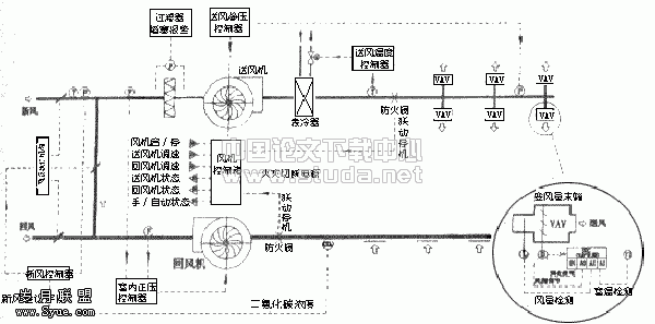 图中控制部分纳入整个大楼的楼宇自控系统(BA),所有系统均采用直接数字式控制(DDC),在管理控制室能对各台空调机组运行状态、室内温度、新风比、送风温度等进行现场调控,并对空气过滤器堵塞状态进行监视。新风量通过新、排风阀及回风阀联动控制来获取,可以人为设定或自动调节,即由设在回风总管内的CO2探测器来自动控制新风量,CO2允许浓度设定值为0.1%。送、回风机通过程序进行协调运行,监控室可以人为设置定风量运行,也可以确定为变频变风量自动运行。当达到最小送风量时,为了满足室内必需的通风量,可以调高送风温度,加大送风量,送风温度由设在冷冻水回水管上的电动二通阀来控制。当室外温度较低时,可采用全新风运行。所有空调箱控制器、变风量末端控制器均与大楼BA系统联风,受监控室BA主系统设定、监视、控制。 变风量空调箱设初、中效两级过滤,初效过滤器采用板式,过滤效率按计重法为30%,中效过滤器为无纺布袋式,过滤效率按计重法为70%,并且配备过滤器阻力超高报警。 室内温度由变风量未端装置(VAV box)控制,温度控制器安装在墙上,位置由设计确定(此处室温应有一定的代表性),安装高度与开关平齐,距离地1.2m。控制器能够设定室温、就地启停VAV箱。VAV box采用矩形、圆形两种型式,标准风量在340~5440m3/h之间,一种型号的最大风量与最小风量之比为5~6倍。风量由多孔平均式风速传感器来测量,并且放大风量信号以便更精确控制。 送风系统设置三级消音,空调箱带消音段,送风总管设消音器,变风量箱出口设消音静压箱。送风口大多数采用条缝散流器,个别采用方形散流器,为了解适应吊顶造型,也采用了一些条形侧送风口。回风口为条形或格栅式风口,均采用吊顶回风,这样能保证房间正常压力,减小回风管内压力的变化对室内压力的影响。