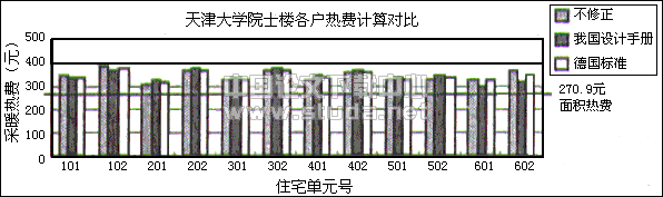 2.用热量热费分摊 推广供热计量收费的难关不是"计量"而是"收费"计量。供热前应有一个合理的社会平均供热成本以确定合理的热价。分摊的理由如下:城市供热是由热源、热网、热用户(室内采暖系统)组成的封闭、复杂的循环系统。是根据最不利气象条件下的最大热负荷建设的。供热系统建成后,无论用户是否用热或用热多少,都要有固定投入的人力、物力、财进行运营、维修和管理。这部分费用是固定的,是计算面积热费的主要依据。供热系统在向用户供热时,除固定费用外还会消耗燃料电力,水和劳动力投入相应资金。这部分是变动费用,是计算计量热费的主要依据。合理确定面积热费,计量热费在总热价中的分摊比例十分重要。国外固定热费是总费用30%~60%。变动费用(计量热费)是热费的70%~40%。变动部分比例较大可以鼓励用户节能,但仍需保证定定的固定部分比例以保证供热的运行。 根据天津大学供热服务中心提供的2001年2月21日~2001年3月22日间的天津大学院士楼总热费为4158.00元,面积费用分摊比例本次研究定为60%,计量费用分摊比例为40%。 根据我国北方地区采暖的室外气象参数和建筑保温现状在同样条件下,不同楼层、朝向、位置的住宅所消耗的热量会有较大的差别。所以,在计算热费时根据楼层、朝向、位置进行修正是必要的。所以,我们分三种情况作了热费分摊计算: (1)考虑朝向、位置、层数等修正,按上述热费分摊比例计算; (2)考虑朝向、位置、层数等修正。按照我国暖通技术人员对房间热负荷影响因素的分析,确定相应的修正系数。其 中: 朝向修正系数 北、东北、西北向:-30%;东、西向:-5%;东南、西南向:-15% 墙体修正系数 双面外墙:-13%;层数修正系数 中间层:0%;顶层:-35%;底层:-20% (3)按照德国标准考虑朝向、位置、层数等修正,相应的修正系数为: 朝向修正系数 南向:0%;东北、西北向:-20%;东南、西南向:-15% 层数修正系数 中间层:0%;顶层:-10%;底层:-10% 对朝向、位置、层数等修正系数,按上述三种不同的处理方法,对各户热费计算结果进行比较,见图2所示。  图2:不同朝向,位置,层数修正后热费计算结果 由图2看出,对朝向、位置、层数用其修正系数,按三种不同的处理方法,即不考虑修正、按我国暖通设计修正、按德国标准的修正,对天津大学院士楼各户热费计算结晶进行比较,表明各户热费发生了变化,但其数值相差不大。 五、结论及建议 1.蒸发式热分配表在天津大学院士楼发行后的单跨越式供热系统中运行状况良好,证明单管跨越式顺流系统适合选用蒸发式热分配表作为热计量手段。 2.根据蒸发式热分配表在2001年2月21日~2001年3月22日间的读值进行热量分配计算,该楼12户居民所消耗热量的总数与总热量相一致。证明在室外温度较高,供水温度较低的情况下,通过对蒸发式热分配表蒸发刻度的修正,可以用于较低供水温度条件下。 3.各户热费计算结果与热量分摊计算中的分摊原则和修正系数有关。对朝向、位置、层数及其修正系数,按三种不同的处理方法,即不考虑修正,按我国暖通设计修正、按德国标准的修正,对天津大学院士楼各户热费计算结果进行比较,其数值相关不大。表明对于类似天津大学院士楼这种大户型高档住宅,由于面积较大,面积热费分摊比例大于50%时,面积分摊的热费较多;同时房间较多,房间各种朝向都有,会对计量分摊热费起到中和作用。此时朝向、位置、层数对总热费的影响较小。建议大户型高档住宅可以不附加朝向、位置、层数修正。但对于一般公寓式住宅(少于100m2),同时面积热费分摊比例小于50%时,必须考虑朝向、位置、层数修正。