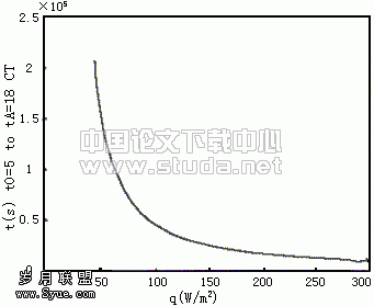 三 数值求解以及结果分析 本文采用数值的方法求其数值解。并在已编程序的基础上,针对低温地板辐射供暖系统在间歇运行过程中较为重要的系统预热量、预热时间和排管间距等因素之间的关系作了进一步的研究,为人们进一步认识该类系统及在实际工程中的应用提供了依据。 1 关于预热量与预热时间的研究 低温地板辐射供暖系统的特性之一就是预热时间长,因此由开始运行到达到设计温度所需要的时间是评价其性能的一个重要参数。本文分别计算了排管间距为225m,不同的预热量下所需要的时间及一定时间内达到;要求的温度所需要的预热量。 图3表示室内空气由5℃加热到18℃时所需的加热量与时间的对应关系。该图直观地表现出加热量与时间的关系:随着加热量的增大,所需要的时间随之减少,加热量与时间成反比关系。当室内温度由5升高到18℃,若加热量为系统达到平衡时所需的加热量110W/m2时,所需要的时间为48小时,即2天,即使加热量达到220 W/m2时,需要时间为3小时。若要求1小时内使室内温度由5℃升高到18℃,则需要的加热量为276.6 W/m2。这主要是因为构造地板层的主要材质豆石混凝土具有良好的蓄热能力。为了使室内的温度在较短的时间内达到所要求的温度,人们就不得不缩短加热的时间,可以从两个方面进行考虑,第一,加大供暖设备的容量,第二,调整盘管间距,提高单位面积的供热量。  图3 t=5℃到18℃所需热量与时间的关系 2 加大供暖设备的容量,缩短预热时间 对于采用燃气炉的独立用户,当采暖房间达到热平衡,即系统处于稳定状态时,所需的热量为110 W/m2。所以采用低温地板辐射供暖系统进行间歇供暖时,为满足人们的舒适性要求,应保证在较短的时间内使室内温度达到设计温度,由计算可知,若要求一小时内达到要求,则设备的容量需增大n=276.6/110倍,即2.51倍。 以上数据充分说明,从满足人体舒适性原则出发,应使室内温度在尽可能短的时间内升高到所要求的温度,而解决这个问题的主要方法就是增加热设备的容量。从方面考虑,则要加大初投资,造成了较在的投资浪费。 3 调整盘管间距,增加单位面积的散热量,缩短预热时间 调整供水排管的间距,增加单位面积的散热量,也可缩短预热时间。表1为不同水温下,室内要求温度为18℃,围护结构达到热平衡时不同间距的盘管供热量。 表1 不同间距的盘管供热量 平均水温 (℃) | 室内温度 (℃) | 不同间距的盘管供热量(W/m2) | | 300 | 250 | 225 | 200 | 175 | 150 | 125 | 100 | 75 | 50 | | 40 | 18 | 92 | 102 | 107 | 112 | 118 | 123 | 129 | 134 | 139 | 144 | | 45 | 18 | 114 | 126 | 134 | 139 | 146 | 153 | 160 | 166 | 173 | 178 | | 50 | 18 | 136 | 150 | 158 | 166 | 174 | 182 | 191 | 199 | 206 | 213 | | 55 | 18 | 158 | 174 | 184 | 193 | 203 | 212 | 222 | 231 | 240 | 248 |