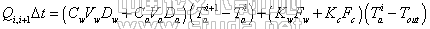 一 引言 地板辐射供暖系统是一种减少建筑物能耗、提高热舒适性的理想供暖系统。从20世纪70年代起,地板辐射供暖就在北美、北欧及韩国等发达国家得到了广泛的应用。但是仍有一些场所如采用分户独立式热源的别墅、高级公寓等仍采用散热器取暖。这主要是因为地板辐射供暖系统本身所特有的物理性能,限制了它的应用范围。 低温地板辐射供暖的热源主要来源于城市热网集中供热,区域锅炉供热及家用小型燃气炉供热。对于城市热网集中供热系统,通常情况下为连续运行,故设计地板供暖系统时,按连续采暖设计。但是对于采用区域锅炉及家用小型燃气炉供热的一般住宅,考虑到居民的作息条件等因素,地板供暖系统按间歇供暖考虑[1],辐射采暖的热负荷就需要考虑一个间歇附加值。本文以目前常用的双回型塑料管布置方式的混凝土低温地板辐射供暖系统为研究对象,根据其加热过程的传热机理,用数值分析的方法对系统运行的全过程进行了动态仿真。在此基础上,对低温地板辐射供暖系统的间歇供暖特性作了深入的探讨和研究,为人们进一步认识地板辐射供暖系统的应用范围提供了依据。 二 传热模型的建立 1 低温地板辐射供暖的构造 低温地板辐射供暖的构造如下:在建筑物的地面结构层做完后,首先铺设高效保温材料,其目的是保温和隔热,而后将能水管用特殊方式双向循环,按一定间距固定在保温材料上,最后回填豆石混凝土,然后再做地面层。其结构示意图如图1所 示:  图1 平板内部结构图 低温地板辐射供暖系统供水盘管双回型布置方式如图2所示。该布置方式的特点是: 人经过板面中心点的任何一个剖面上看,都是高温管和低温管间隔布置,易于造成"均化"效果。故可认为流经塑料管的热水散发的热量为一均匀热量值Q(w)。  图2 双回型塑料管布置图 2 低温地板辐射供暖的物理性能分析及其模型建立 在低温地板辐射供暖系统中,塑料盘管卡钉固定在绝热保温材料-聚苯乙烯上,故可认为结构层为绝热层,没有热量损失。同时,混凝土地板的四周也常围有轻型保温材料,也可近似认为是绝热的。 对于地板表面,对流换热和辐射换热同时进行。离开地板的总热量为对流热量和辐射热量之和。本文用综合换热系数a[2]来考虑对流和辐射两方面的综合效应,a=ac+ar,式中a为综合换热系数,W/(m2/℃);ac为对流换热系数,W/(m2/℃);at为辐射换热系数,W/(m2/℃)。一般供暖条件下,平均辐射和对流换热系数分别为6.2 W/(m2/℃)和4.3 W/(m2/℃),故地板表面的综合换热系数为10.5 W/(m2/℃)。  图3 平板传热模型 本文传热模型的建立如图3所示,在间歇供暖过程中,地板辐射采暖的加热过程为一个不稳定的导热过程,可分两部分考虑。首先,供水盘管所散发的热量Q一部分被豆石混凝土本身所吸收,用于提高豆石混凝土本身的温度,另一部分热量通过地板表面与房间的空气进行对流换热,用于提高室内温度。为计算简便近似认为从时刻i 到i+1,其能量平衡式为: (1) (2) 其次,通过地板表面对流换热所得到的热量主要用于如下作用,第一,空气和墙体本身吸收一部分热量,增加了空气和墙体本身的内能(因为玻璃的比热容积很小,故窗户内能的变化基本可忽略不记),提高室内空气和墙体的温度。第二,由于室外温度低于室内温度,一部分热量通过维护结构将热量传到室外。则从时刻i到i+1,由地板表面向室内所散发的热量为室内向室外的传热量与室内空气及围护结构所吸收的热量之和,即 (3) 式中,Q为供水盘管所散发的热量,W;Q i2i+1为时刻i到i+1由平板向室内所散发的热量,W;kw,kc分别表示墙体和窗的传热系数,W/(m2/℃);Ff, Fw, Fc分别表示地面层、墙体窗的面积,m2;Cf, Cw, Ca,分别表示豆石混凝土、围护结构及空气的比热容,J(kg/℃);Df, Dw, Da分别表示豆石混凝土、围护结构及空气的密度,kg/m3;Vf, Vw, Va分别表示豆石混凝土、围护结构及空气的体积,m3;Tout为冬季室外供暖计算温度,℃; 分别表示i 时刻和i+1时刻室内地板表面的温度,℃; 分别表示i 时刻和i+1时刻室内空气温度,℃;Δt表示时刻i到i+1的时间间隔。以上两式为加热过程中能量方程式,在 已知的情况下,可以求得I+1时刻的 。 对于初始时刻,设地板内部温度均匀一致,并等于室内初温,即 (4) 综上所述,由式(1)~(4)构成了低温地板辐射供暖系统在间歇供暖过程中由非稳定状态到稳定状态的动态仿真控制方程和定解条件。本文以某地一公寓房间为例进行动态仿真。该房间尺寸(长×宽×高)为4.4m* 4.4m* 2.8m,外墙墙体为370mm厚的砖墙,窗户采用铝合金塑钢窗,窗面积为2.1m2。地面构造层如图1所示,可认为豆石混凝土层的平均厚度为70mm.