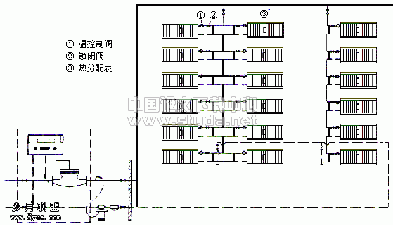 院士楼的供暖系统采用上供中回的形式,在散热器的进水管和出水管间加装跨越管,散热器进水支管上装设恒温阀,是单管带跨越管的顺流式系统。