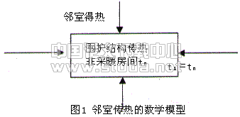 邻室设计温差不易直接确定。本文拟通过建立数学模型,计算邻室得热温差,从而间接确定邻室设计温差。邻室得热温差是指某房间不采暖时,考虑到邻室传热存在,该房间与相邻其采暖房间之间的温差。