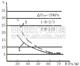 表-2的计算结果及图(三)、图(四)的直观图示说明影响N值的主要因素包括:①采暖热水参数,对系统的水力平衡有影响,因为它决定了立管各层重力水头的大小,重力水头的大小对N值有较明显的影响,而且重力水头的大小,重力水头的大小对N值有较明显的影响,而且重力水头系数B值宜选取下限值,因为在实际上过程中,重力水头是变量,且多数情况下,低于理论计算值(即:低于设计工况下的重力水头值),如果B值选取过高,将会使在大部分运行时间内,重力水头对系统水力平衡实际影响严重偏离设计工况,从而恶化非设计工况时的水力平衡,结果是可能导致多数运行时间内出现"下热上冷"现象,所以我们在《规程》中规定B的取值范围为1/2~2/3。②立管平均比摩阻R的取值对N值影响较大,且当R≤50Pa/m时,其影响更明显,理论的推导的结果表明一般室内系统管道比摩阻取值60~80Pa/m的作法,不适合下行下给的新双管系统,对新双管系统R值的合理取值范围应为30~40Pa/m,且当采用上限值时,ΔPuser的取值也应是上限值,这一点非常关键。③各层分环系统的水力损失ΔPuser,在其他条件确定时,对N值的影响非常明显,如表-3所示,当R=35Pa/m时,对应于ΔPuser =15KPa和ΔPuser =30KPa的N值分别为14和29,相差达50%。可见欲使一对立管负担的层数较多时,ΔPuser应取的较大一些,工程计算的实践证明一般宜取ΔPuser =25~30kPa,这一结论不难理解,因为较大的分环阻力不仅对改善水力平衡、加强水力稳定性有利,也对消费重力水头的影响有得。传统的双管系统显然很难满足分环系统高阻力的要求,而共用立管的水平分环系统较易实现较高的ΔPuser值,不过有一点值得注意:ΔPuser值的确定与户内系统的管径选择有直接关系,以住户内系统管径确定是以平均比摩阻60~80Pa/m为依据的,但以此为依据确定的系统管径规格,无法保证理想ΔPuser值,除非附加阻力装置,否则ΔPuser过小,而且过小的比摩阻取值也给室内管道系统的安装带来困难,建议户内系统平均比摩阻取值为100~150Pa/m。