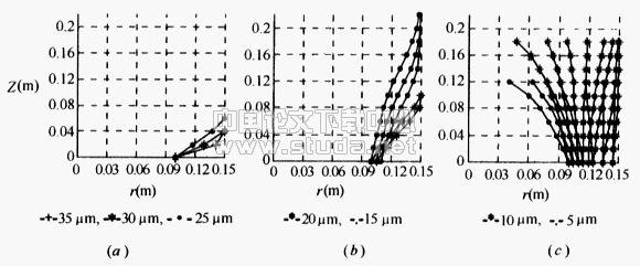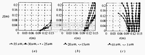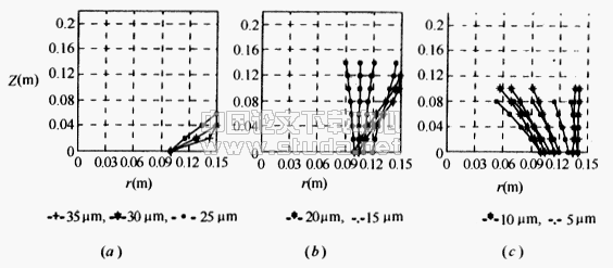 在不同的径向位置上,根据颗粒运动轨迹图网格点上不同粒级颗粒权重不同,得到浓度变化曲线。如图6所示,各图中数据线的单位颗粒群的初始浓度C0。 | |||||||||||||||||