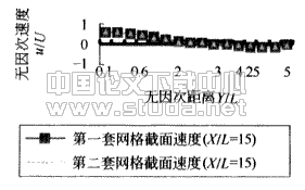 室内流体流态为稳态紊流,采用LRN(Low-Reynolds-Number)模型。压力、速度通过SIMPLEC算法耦合求解。入口边界参数给定,出口边界变量的法向梯度为零。以入口速度U为基准速度,以入口尺寸L(1m)为基准尺寸。基于B方法的网格生成为X×Y方向网格数为120×100。之后,作者重新布置网格(80×60),取某垂直截面段(X/L=15)并比较了两者的水平速度分布。如图5可见,两者几乎无差别,这可以说明本文格式应用于工程实际时,对非均匀网格具有较好的适应性。