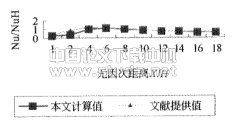 图9是截面(X/H=10)上的流速分布,与文献[4]结果相吻合。另外,作者还与文献[5]比较了不同截面上Nu/NuH数,如图10所示,两者较接近。