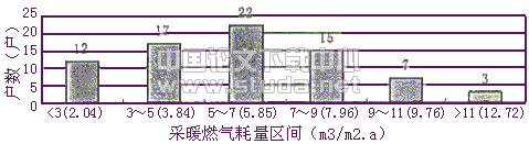 对76个有效样本中耗气量的分布规律未分选了统计,横坐标轴括号内为该部分样本的单位面积燃气耗量平均值,具体见图1。可见,大部分住户的单位面积耗气量位于平均耗气量5.85m3/m2.a附近,耗气低端住户的要大于耗气高端住户的数量。