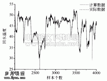 输入参数为当前时刻的①室外温度(i); ②供水流量(i));③补水流量(i); ④供水温度(i);⑤回水温度(i);,共五个输入量。输出量为未来时刻的①室外温度(i +1)(i+2);②供水温度(i +1)(i+2);③回水温度(i +1)(i+1);共六个输出量。其中每一周期间隔15min。训练样本为前2000个数据组,测试样本为后2000个数据组。输出曲线有训练样本与计算数据比较曲线和测试样本与计算数据比较曲线。