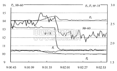 从图中看到随着冷凝器风量的增加,Pd压力逐渐降低,Pw逐步升高,Ps未发生显著变化,ΔPws逐步增加。当ΔPws =0.91bar时,压缩机活塞行程发生变化,存在20s的时间滞后。此滞后就是Pw逐渐上升的过程;压缩机活塞行程减小时,Pd压力渐变到一个新的稳定值,而Pw开始下降,逐步回到前一个稳定值,Ps逐步上升到稳定值。制冷剂流量Mr在冷凝器风量增加时,由于冷凝效果好,排气压力降低,制冷剂流量增加,而活塞行程减小,又降低,有一个先升后降的过程。冷凝风量突然变化,Pd却不突变是由于冷凝器有较大的热惯性,Pd的不能突变造成了时间滞后。