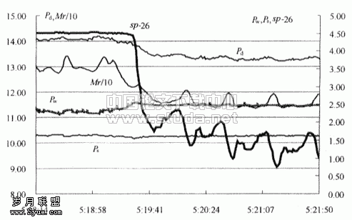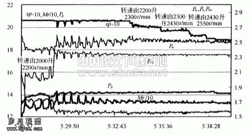 图5表示了压缩机转速在2000r/min时,蒸发器风扇从高档调到低档的特性变化。开始,Pd、Ps渐降,Pw渐升,Mr下降;当活塞行程变化时,Pd下降的梯度加大,Ps略上升,Pw停止上升,活塞行程、制冷剂循环量,Pd、Ps、P逐步稳定在适应车室环境的新稳态值上。