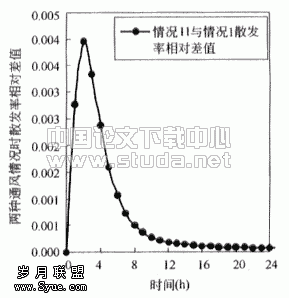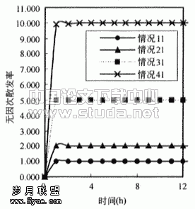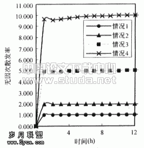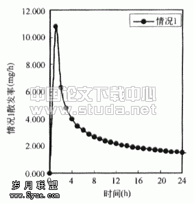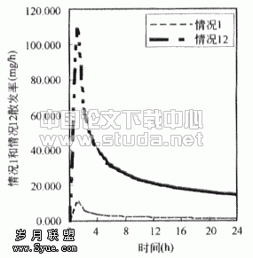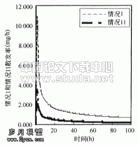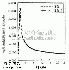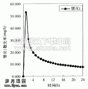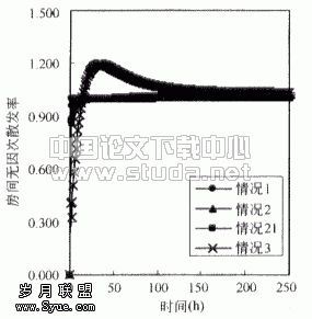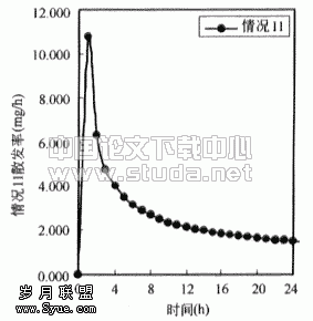 ![]() 图3.3 房间内苯无因次浓度(以情况1为基准) | ![]() 图3.4 情况1散发率 |