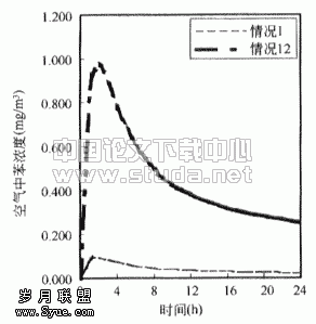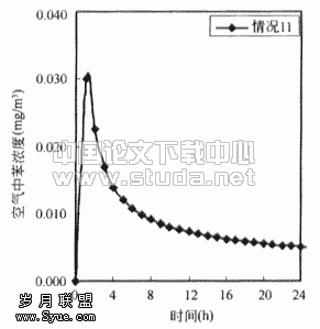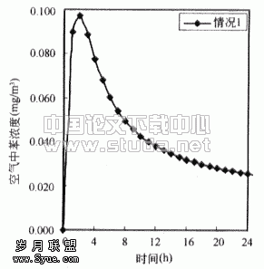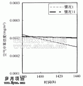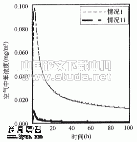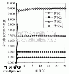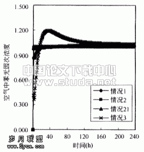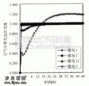 ![]() 图3.1 情况1时房间内苯的浓度 | ![]() 图3.2 房间内苯无因次浓度(以情况1为基准) |
