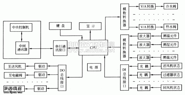 1 引言 空调耗能是建筑物耗能中的大户,随着能源供应的日趋紧张及人们对室内热环境、空气品质的要求愈来愈高,迫切要求在保持空调区域一定舒适度的前提下最大限度地降低空调能耗。空调自控系统可以使建筑内环境更舒适、设备运行更可靠、能源利用更充分,是楼宇空调系统重要的组成部分。但是由于资金缺口和工程进度等等问题,许多已建成的商用建筑和办公大楼的空调系统往往都没有设计或安装自动控制系统,随着建筑物的投入使用,会发现空调区域的温、湿度波动很大,往往会超过允许的变化范围,这时业主会提出空调系统自动控制改造的要求。 这种旧有空调系统进行自动控制改造与新空调系统的自控设计相比有许多不同之处,比如旧有的空调系统在运行中往往遭到一些人为因素的影响,致使风系统平衡遭到破坏,加装自控系统前必须先对旧有空调系统的风道系统重新进行平衡调整,不然自控系统可能达不到预期限效果;另外加装自动控制系统后对原空调系统的制冷、供热和水循环系统都交有一定的影响;同时在改造进程中也会遇到一些特殊的问题,有些问题在旧有空调系统的自控改造中是要特殊考虑的。 笔者于2001年参加了某广播电视大楼的空调系统自动控制改造的工作,该大楼的空调系统当初由于种种原因没有安装自控系统。随着室外气象条件的变化和室内负荷的变化,空调区域的温、湿度发生了很大的波动,常常会超过允许的变化范围。几年运行下来,每年都发生有的房间过热有的房间过冷的问题。室内工作人员为了防止过热或过冷大多将本室的部分送风口用胶纸等物遮挡,结果导致了风系统阻力的不平衡,破坏了其他房间的温、湿度状况,造成整个系统的失调。很多工作室出现了冬热夏冷的情况,这大大影响了工作人员的工作效率,而且对工作人员身体健康有着很大的损伤,且给室内高级机器设备的正常工作造成了一定的隐患(情况严重时会影响对温、湿度比较敏感的设备的正常工作)。由于系统失调,冷站和锅炉房提供的能量没能合理使用,造成极大的浪费,运行费用大大提高。在这种情况下,业主提出了给空调系统增加自动控制的要求。下面我们对此空调系统自控改造进行中遇到的问题和相应采取的解决方法作一个介绍,希望能给空调、自控设计和运行管理人员一些启迪。 2 空调控制系统方案的确定 室温控制是空调自动系统中重要的环节,它是用温度敏感元件来控制相应的调节机构,使得送风温度随扰量的变化而变化。改变送风温度的方法有:调节加热器的加热量或冷却器的冷却量,调节新、回风混合比或一、二次回风比等。此广播电视大楼的空调系统是由11个空气处理机组组成的全空气系统,每个机组都是一次回风式系统,本着、简便的方针,此次空调系统的改造我们采用了常用的调节加热器的加热量和冷却器的冷却量的方法以改变送风湿度。室内相对湿度的控制可以采用两种方法:间接控制法(变露点)、直接控制法(变露点),此广播电视大楼很多工作室因一些仪器设备的缘故对室内相对湿度的要求较为严格,为此我们选用了直接控制法去控制室内空气的相对湿度,即用相对湿度敏感元件,控制相应的调节机构,直接根据相对湿度偏差进行调节,以补偿室内热湿负荷的变化。另外我们还加了一些辅助控制设备以更好的完成空调系统的自动控制。在此次改造进程中自控系统的所有电动调节阀和执行器我们全部采用了美国Hownywell公司的产品。 空调机组控制系统流程图及文字说明如下:  图1 空气处理机组自动控制系统流程图 如图所示我们在回风机进程处设置了温、湿度传感器(AI),以测定总回风的温、湿度,为控制器的调节提供依据。在冷却器的供水管路上增加了水量调节阀(AO),夏季根据室内温度(接近回风温度)和设定湿度之间的差值,自支控制阀门的开启度,使室温控制在要求的范围内。另外在加热器的供水管上相应的增加了热水流量调节阀(AO),用于冬季的室温控制。我们在加湿器的供汽管道上加装了电动调节阀(AO)以根据室内相对湿度与设定湿度之间的差值,自动地调节蒸汽的加湿量,以确保室内相对温度维持在要求的范围内。同时我们在过滤器的两端设置了压差传感器(DI),用以测定过滤器的积尘情况,在过滤器的积尘达到一定程度后,发出报警信号,用以提醒检修人员及时更换或清洗过滤器。 广播电视台在录制节目进对噪声的要求很高,但由于此广播电视大楼空调系统在噪声处理上有些欠缺,录音室在录制节目时往往很难满足要求,为此工作人员要求在录制节目过程中关闭相应的空调机组以完成高质量的节目录制。为了自动检测、控制空调机组的启停,我们在送、回风机的进出口设置了压差传感器,用于检测风机的工作状态;在送、回风机的启动电路上安装了自控触点(DO)用以自动控制风机的启停。 控制系统我们选用了集散式控制系统DSC(Distributing Control Systems),它是70年代中期推出的一种机控制系统,集计算机、通信、控制、屏幕显示等技术为一体,实现了危险分散,控制分散,控制管理集中等功能,是一种面向工程师的计算机控制系统。笔者参与的改造工程应用的是我们自己开发的一套空调集散式控制系统,运行效果良好。 整个系统采用总线式结构,现场控制器以MCS-51系列单片机为核心开发,主监控机与现场控制器之间通过RS-485