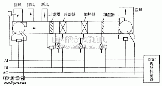 图2 现场控制器原理图 主监控机通过网络控制器把整个系统连接起来,通过此通讯网络采集11台下位机传送来的各空调机组的运行数据。其采用windows操作平台,以图形方式及时地显示11套空调机组的运行状态,同时可以对各套空调机组的运行数据进行分析,指定出切合实际的运行方案。体制改革有控制软件采用我们自行研制的产品,可以保证系统安全可靠的工作。 3 一个空调机组负责的两个工作室冷热不均匀的问题及解决方法 在冬季运行工况下,有一空调机组负责的两个相邻工作室,一个较热,另一则较冷。由于两个工作室由同一空调机组负责送回风,所以控制起来十分麻烦。究其原因是在最初的空调设计时考虑不周,或者是电视台在使用中更改了房间的使用功能所致。 一个工作室(设为A)其外维护结构很少且室内有很多机器及工作人员,散热量很大,在冬季几乎不用供热风就可满足要求甚至室内还会过热,这时应该考虑的是增大新风比降温;而另一个工作室(设为B)其外维护结构面积很大且机器不多(比如办公室等),冬季工况下需要持续的送热风才能满足室内热舒适性要求。虽然机组运转起来后可以在一定程度上混合冷、热丙部分室内回风,缓和两个工作室的冷热不均问题。但是在保证B工作室室内温度时,A工作室有时室温过高,严重影响了室内的工作人员的工作效率及机器的正常运转。本来可以用调节新、回风比的方法解决问题,可是这套系统不同于其他10套系统,它没有回风阀,只有新风阀。我们当时尝试遮住室内部分回风口的方法弥补没有回风阀的缺陷,结果其工作人员反映效果很好,不但温度舒适,感觉空气也比以前清闲。这种方法相当于增加了新风比例,从一定程度上缓解了问题,但这只是临时解决的问题的方法。