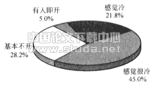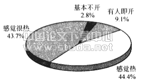 如果单从住宅空调的普及率来看,上海超过美国的任何一个地区。而美国由于是以独立式住宅为主,因此中央空调(户式空调)普及率要远高于上海。上海很多家庭还仅限于只有一个房间安装房间空调器(RAC),解决"有"和"无"的问题,还谈不追求更舒适的室内环境品质。 另一方面,上海很多家庭空调使用时间很少。图3和图4是调查得到的空调使用情况。  图3 夏季空调使用情况调查(748户)  图4 冬季空调使用情况调查(726户) 按表3的条件判别,并按上述调查结果加权平均,可以估算出上海住宅空调的全年平均使用小时数为800~900小时。 判别空调开启与否的温度频段和同时使用系数 表3